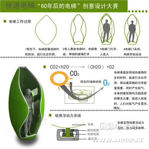 获奖者之一,来自上海美术学院的大二学生吴江(设计师笔名)在谈到自己的参赛感想时表示:“作为一名有志于投身工业设计行业的学生,我在此次电梯设计大赛中获益良多。在整个参赛过程中,我第一次了解到快速电梯所提倡的“安全、舒适、节能、环保”等设计理念,学会从电梯设计制造者的角度谨慎思考,真正认识到何谓以人为本的电梯设计。”其实,拥有与吴江同样想法的参赛者不在少数,正是这些参赛者们所表现出的卓越才华,将“节能环保”的电梯设计理念发挥得淋漓尽致。参赛者们在作品中对未来电梯的动力能源进行充分假想,不仅将太阳能、风能、水能等新型再生能源融入到设计作品中,甚至连空气、废弃物等都被设计者们赋予了新的意义。
