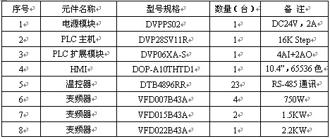 上述表格仅列举出控制系统主要元器件,此外还包括低压电器(低压断路器、电磁接触器、电磁继电器、按钮、指示灯等)、检测传感器(接近开关、行程开关等)、变频器通讯电缆等,此处均不予赘述。