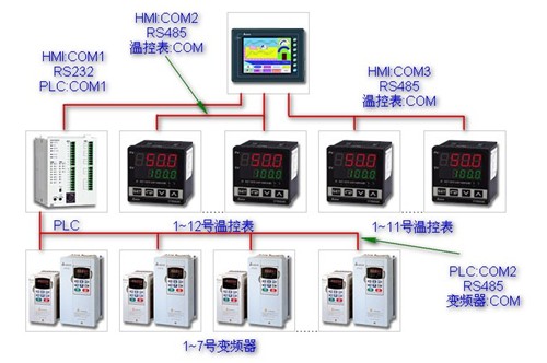 塑料床垫成型机控制系统采用台达人机界面作为主站监控设备,充分利用人机界面DOP-A10THTD1三个通讯口,人机COM 1(RS232)连接下位PLC控制器COM1通讯口,通讯交换工艺参数数据;人机COM2(RS485)连接机头控制系统12台温控表,人机COM3(RS485)连接主机控制系统11台温控表,人机界面可以设定不同控制区域温度SV值,显示温度PV值;PLC通讯口COM2(RS485)通讯连接7台变频器,PLC通讯写入变频器给定频率、变频器启动停止命令,读取实际输出频率;人机界面设定电机目标转速,读取电机实际转速。