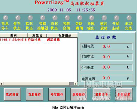 组态软件运行后,点击公司信息图片后,即可进入高压软起动监控主界面,如图2 所示,