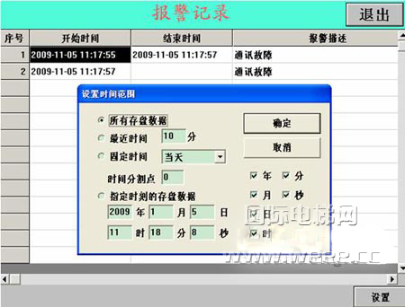 点击“设置”按钮,将弹出设置时间范围对话框,用户可以通过选择待显示的历史报警记录的时间范围,调出当时的系统故障记录,并可将该记录进行打印处理。
