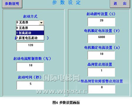 (4) 操作画面: 在操作画面中可查询和设置软起动器的全部运行参数,还可查询实时、历史故障信息和设备状态并可按要求设定和打印出实时报表和历史报表。