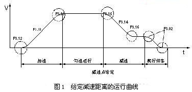 (5)到达曲线减速点后,变频器开始减速停车。进入平层一定距离(F4.07平层距离调整)后,速度减为0,经延时后,变频器输出抱闸关闭命令(BR),同时输出电梯停车信号(Y1),要求控制器切除运行命令(FWD);