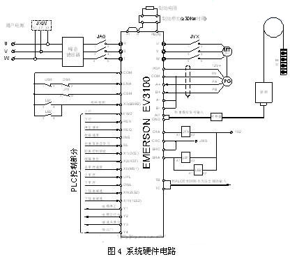 变频器选用艾默生CT的EV3100电梯专用变频器。除了矢量控制、转差补偿和负载转矩自适应等功能,还具有抱闸控制及检测、电梯超速检测等电梯专用功能。为实现闭环矢量控制、提高系统的动态性能和实现零速抱闸控制,在曳引电动机轴端加装旋转编码器。该编码器信号不仅作为曳引电动机的速度反馈,利用 EV3100变频器的分频功能,还可实现对电梯的数字位移控制。系统硬件电路如图4所示。[4]