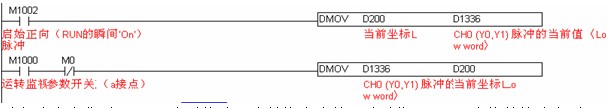 当机床在定位时,PLC实时的读取当前的脉冲数,随时将D1336内的数值读出到D200进行保存。在机床再次起动时,再将D200内保存的数值送入到D1336中,这样,就可以在机床关机时,能保持机床的当前坐标。