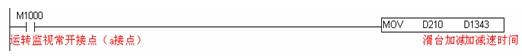 使用定位指令时,也可以指定定位起动时的加减速,设置脉冲输出的加减速一个作用是使机床能平稳地起动停止,另外一个用处是伺服电机驱动器对输入脉冲用一个响应频宽,如果送给伺服电机驱动器的定位脉冲是突变的,有可能会造成驱动器对定位脉冲的丢失。设置脉冲输出的加减速只要设置脉冲输出通道相应的加减速时间即可。CH0的加减速时间在特殊数据寄存器D1343中设置。EH系列PLC加减速不可低于10mS。若低于10mS或高于10000mS,则将以10mS输出。如果不对D1343进行设置,PLC会以出厂默认值100mS执行。