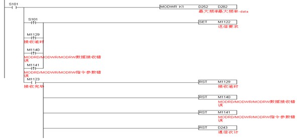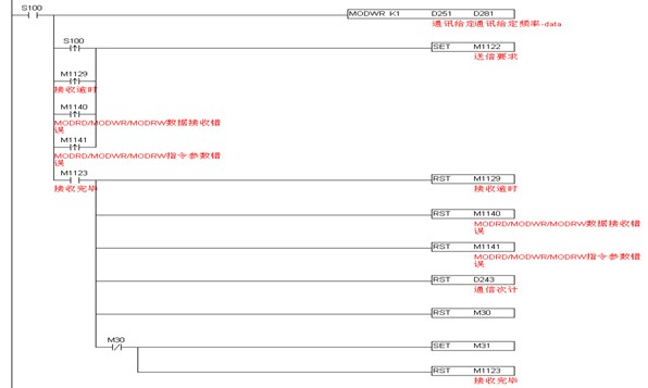 若通信时回传数据错误,则标志继电器M1140置ON,程序中由M1140再次触发通信指令。