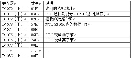 D1050~1055:如果MODBUS通信格式为ASCLL码,则PLC自动会将回传的D1070~D1085内的ASCLL码转换为HEX格式,将存于D1050~1055寄存器内。