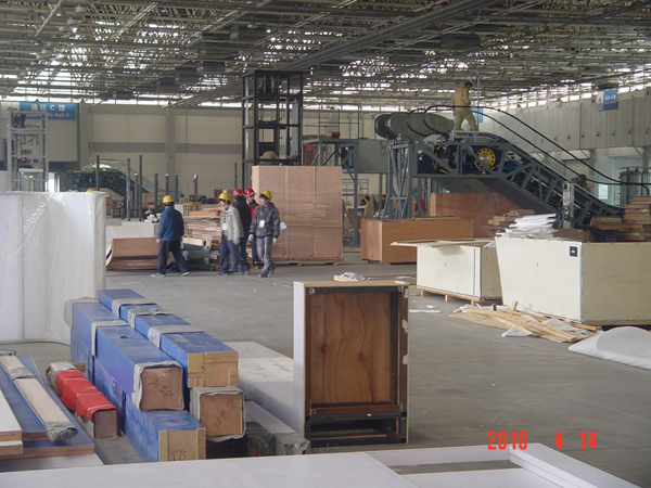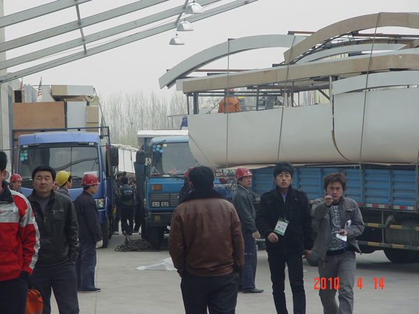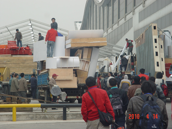 施工人员紧张有序的工作,他们将在一周内在这个一览无余的光地上建出一座座气势宏伟的展台,体现企业实力、提高企业形象,在电梯界的“世博会”中给企业加分。