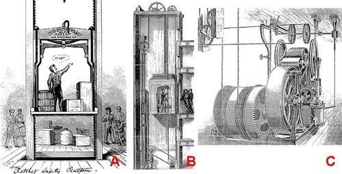 电梯的前身是以水力或蒸汽为动力的升降机。1851年伦敦世博会上出现了水力作动力的升降机。1853年美国纽约世博会上,出现了由美国人奥的斯设计的蒸汽升降机。