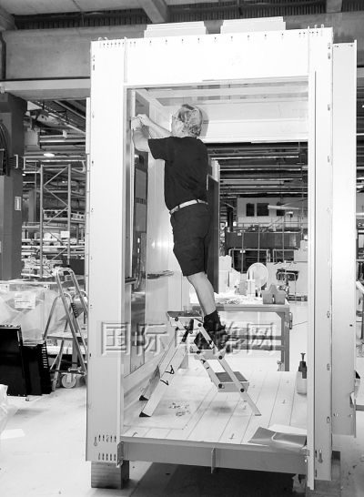 图为在芬兰南部城市许温凯的通力集团的生产车间,一名工人正在安装用户专门订做的电梯。