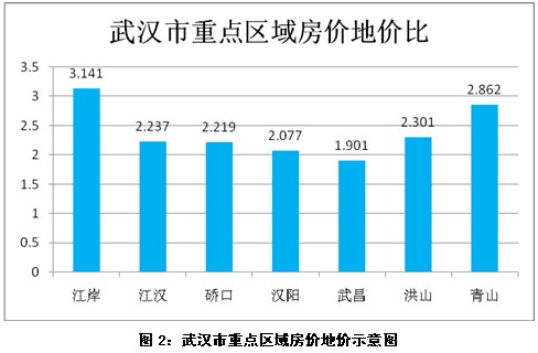 硚口区在2009年市场上供需失衡现象严重,处于供不应求的状态,因此在销供比图上排在第一位。在房价地价比上该区域排名比较靠后,主要是该区域的房价温和,作为热点板块该区域地块出让在市场上竞争激烈,地价也呈快速走高的趋势。由于该区域房地产发展时间较短,新旧房差价较小。而且在房地产发展的强劲冲击下,房价增长较快,与收入增长情况形成一定反差。但总的来说,该区域具有较大的投资价值。