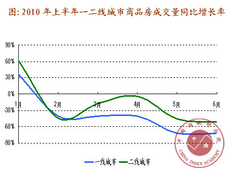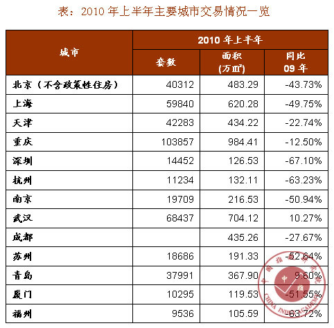 虽然今年1-4月房地产成交增速较大,但在房地产新政影响下,5、6两个月主要城市市场成交显著下降,导致上半年主要城市成交面积相比09年同期水平普遍下跌。重点城市中,仅武汉和青岛成交面积同比09年上半年有所上升;杭州、上海、深圳、南京、苏州、厦门、福州等地上半年成交量相比09年同期,下跌幅度均超过50%。