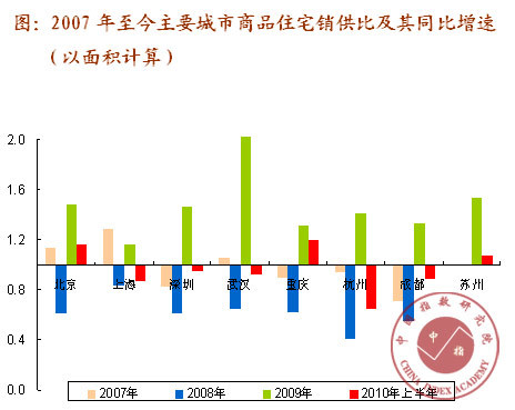 由于商品房成交面积的持续下降和批准上市面积的增加,和2009年相比,2010年1至6月份重点城市销供比皆出现了较为明显的下降,其中,武汉销供比由2009年的2.1下降至0.9,杭州销供比由2009年的1.4下降至0.7,北京和上海销供比也下降了0.3,市场供求关系的转变逐步形成。
