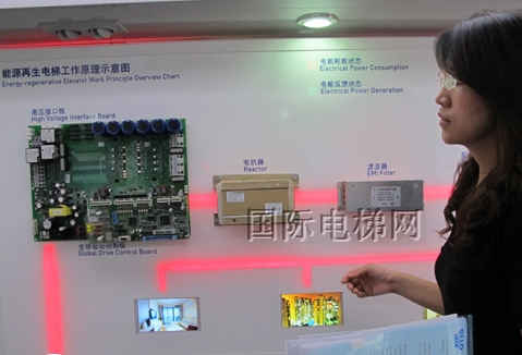 “这是能源再生电梯的工作原理示意图,这种电梯在运行时可以将势能转化为电能,然后供其它用电设备使用。”据西子奥的斯讲解员介绍,当电梯往下走时,会产生大量能量,传统电梯无法回收这部分电能,而能源再生电梯却可按照能量回馈的原理,将电梯在上下运行间的势能,通过能源再生变频器转换成清洁无污染且符合国家电网标准的电能。
