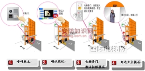 楼宇对讲系统“电梯控制器”采集每户对讲分机的“开锁”按键信号,并提供通信协议,实现楼宇对讲系统与电梯楼层控制系统的通信;电梯楼层控制系统从“电梯控制器”上获取业主的楼层信号,使该层的电梯按钮在电梯开门后一定时间内可以被登记,访客进入电梯后按键即可到达相应楼层。