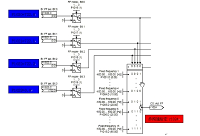 多段速的选择与实现是利用参数P0722.0~P0722.7存放了数字输入1~7的状态,如图3所示当把P701~P703设置为17后,变频器会自动把图3种的参数设置为如下的值:P1020=722.0,P1021=722.1,P1022=722.2。当输入状态变化时,会选择P1001~P10016中的速度值防御参数r1024中,再把r1024的值连接到主给定通道上作为多段速的输出值。