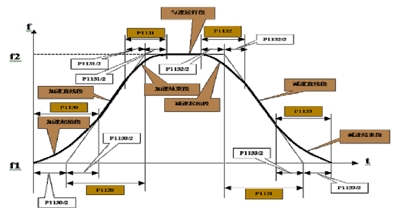 当主控制板通过端子输入给变频器,变频器就会按设定的速度控制曳引机运行,电梯的一次启动和停止曲线如图4所示。在启动过程中,加速度起始段曲线有P1130来确定,加速度直线段有参数P1120来确定,加速度结束段曲线由参数P1131来确定。之后进入匀速运行阶段。在减速起始段曲线由参数P1132来确定,减速直线段由参数P1121确定,减速结束段曲线由参数1133来确定。上述参数的单位为时间,要根据速度时间换算成速度和加速值,并根据电梯技术条件和规范的要求来调整,满足舒适感和效率的要求。