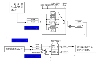 变频器每次上电后要进行本身的初始化工作,由于所选用的功能模块不同,很可能在没有完全初始化完成后前输出变频器准备好,可以工作的信号,这时若有呼梯信号主板就会输出给变频器信号驱动电梯运行,这就造成系统的不正常工作,给安全运行带来危害。为确保变频器完全初始化好,对信号经过一个定时器延时输出,同时主板要求变频器输出的信号为保持型的,为此在把信号经一个RS触发器保持,如图2所示。此时,真正的“Ready”信号就是RS-触发器的输出r2841了,将r2841连接到输出端子上即可(例如,P0733=2841)。