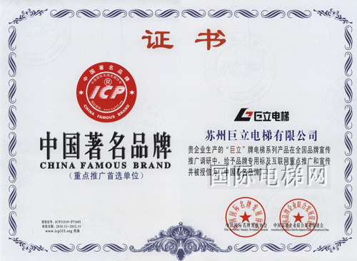 苏州巨立电梯有限公司系列产品被评定为“中国著名品牌”。