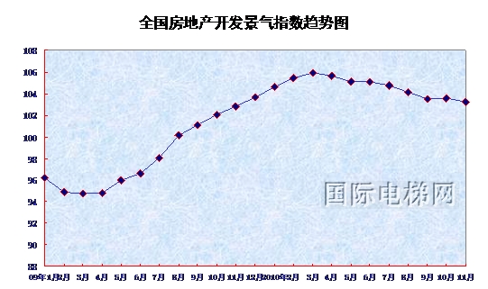 11月份,全国房地产开发景气指数(简称“国房景气指数”)为103.20,比10月份回落0.37点,比去年同期提高0.42点。