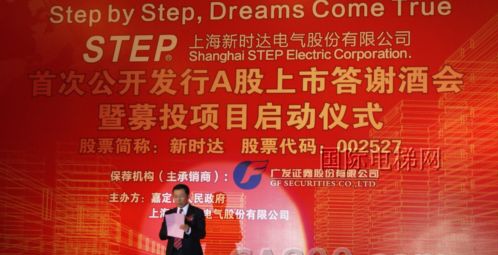 2010年12月24日,随着深圳证券交易所开市宝钟的敲响,新时达首次公开发行A股上市成功,首次发行达5000万股,发行价格16元/股,市盈率59.26倍,发行募集资金也将投向电梯专用系列变频器扩建技术改造项目、电梯控制成套系统扩建技术改造项目以及企业技术中心扩建项目,总投资1.85亿元。为纪念这一具有里程碑意义的事件,于2011年1月7号在上海西郊宾馆隆重举行了首次公开发行A股上市答谢酒会暨募投项目启动仪式。