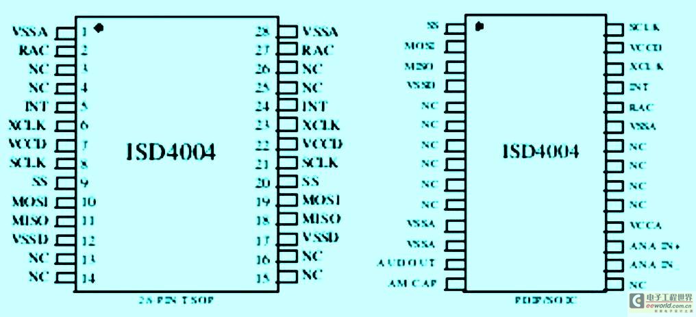 图2 ISD4004系列芯片引脚图(TSOP及PDIP、SOIC)