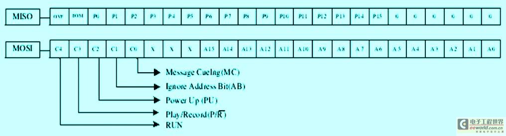 注:IAB置0时,录、放操作从A15A0地址开始。为了能连贯录、放到后续存储空间,在操作到达该行之前,应发出第二个SPI指令将IAB置1,原则器件在同一地址上反复循环。这个特点对语音提示功能很有用,RAC脚和 IAB位可用于信息管理。