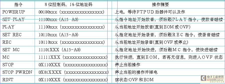 OVF标志指示ISD录放操作已到达存储器的末尾。EOM标志只在放音过程中检测到内部的EOM标志时,此状态位置1,如图3所示。SPI指令码如表1所示。
