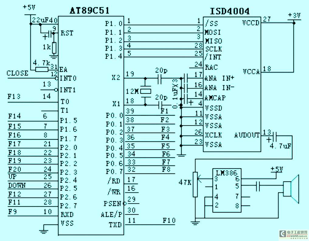 从图10中可以看出,单片机和ISD4004之间的连线较少。P1.0接 ISD4004的片选引脚/SS,控制ISD4004是否选通;P1.1接ISD4004的MOSI串行输入引脚,语音芯片从该引脚读入放音的地址; P1.2接ISD的串行输出引脚MISO,单片机从该引脚接收从语音芯片传来的信号;单片机AT89C51的P1.3接ISD4004的串行时钟输入端 SCLK,作为ISD的时钟输入,用于同步MOSI和MISO的数据传输;P1.4接ISD芯片的中断引脚/INT, 接收从语音芯片发来的EOM信号,获得语音段结束信息, 控制其放音或快进操作;ISD4004音频信号输出引脚AUDOUT通过一滤波电容输出至外部功放。