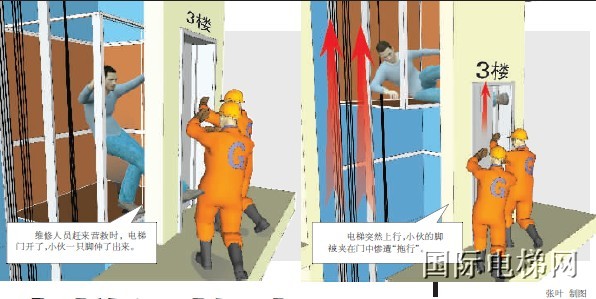 6月15日晚11 点半左右,南京江宁竹山路傣妹火锅店发生一起事故。一名18 岁的小伙在店里饮酒用餐后乘坐电梯想从4 楼下楼,电梯却不知为何发生故障停在大约三楼的位置不动了。维修人员赶来营救,不料这时又发生意外:电梯的门开了,小伙把半只脚探出门外,电梯门却又突然关闭,开始往上跑。小伙的脚被夹在门里,惨遭“拖行”和 “摩擦”。事故造成小伙的半只脚掌连骨带筋全都断了,仅剩表面一些皮肉相连。