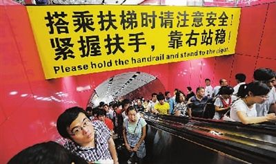 7月7日,广州地铁公司在二号线“广州火车站”站换乘地铁五号线的超长电动扶梯上设置的安全提示。