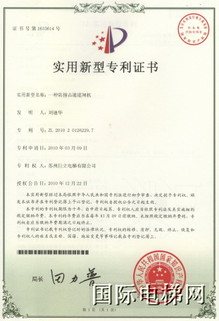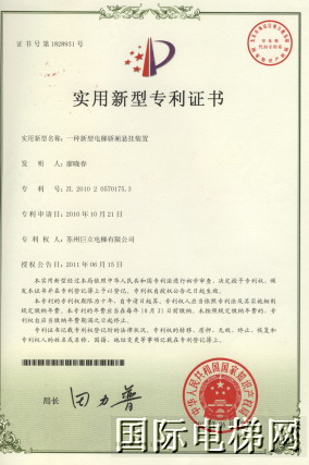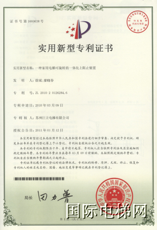 专利二:家用电梯可旋转的一体化上阻止装置。