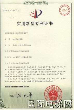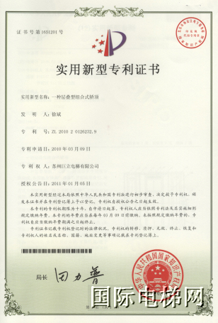 专利四:层叠型组合式轿顶,提供一种轿顶、吊顶合二为一的解决方案,为使用新型环保材料创造了应用条件。