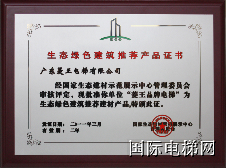 广东菱王电梯有限公司因为对绿色环保产品孜孜以求的钻研精神及在行业中对节能环保产品的突出贡献,被破格批准进入国家生态建材产业示范中心。经过近一年时间与众多示范中心的企业进行交流学习及加强自身研发后,菱王电梯对绿色产品,低碳环保概念有了更为全面的认识,今年四月份在获得由国家生态建材产业大会颁发的“创新产品奖”后,经审批后,再次获得由国家生态建材示范展示中心管理委员会颁发的“生态绿色建筑推荐建材产品”证书。正式成为国家生态建材展示中心推荐产品。