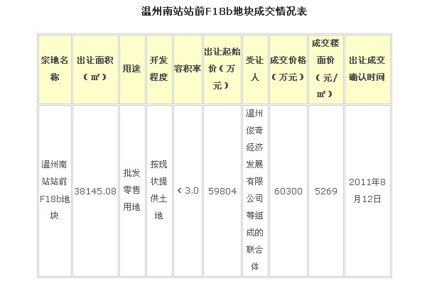 温州南站站前F18b地块成交情况表