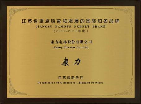 日前,康力电梯股份有限公司荣获由江苏省商务厅颁发的“江苏省重点培育和发展的国际知名品牌”称号,这是对康力电梯多年来努力开拓国内外市场取得成绩的又一肯定。