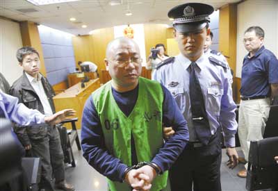 昨日上午11时许,身着号服的沙志刚被押解上法庭。