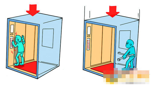 如遇到冲顶或蹲底事故,也就是俗称的电梯下坠、电梯冲顶,前者指电梯的轿厢在控制系统失效的情况下发生垂直下坠的现象,后者指轿厢失去控制冲到电梯井道的顶部。