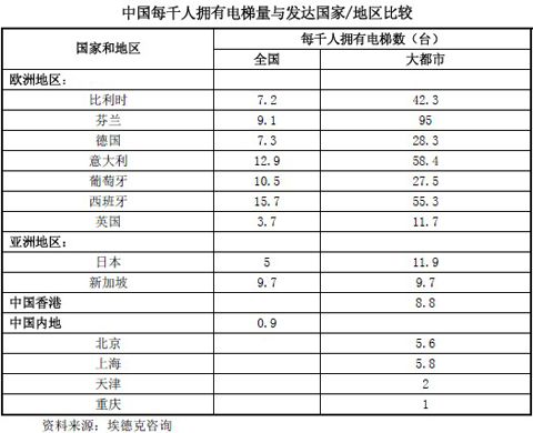 人均电梯拥有量是反映城市化水平的重要标志。我国人均电梯拥有量1990年只有2 台/万人,发展到2008 年已经达到8.6 台/万人,年复合增长率达到20%。尽管人均电梯拥有量增长迅速,我国目前的人均电梯拥有量仅是世界平均水平的一半,离发达国家的人均电梯水平还有很大的差距。