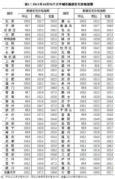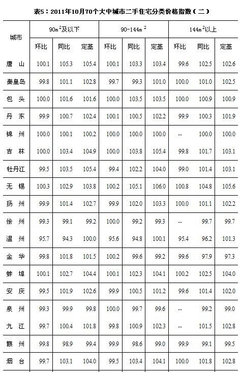 (二)与去年同月相比,70个大中城市中,价格下降的城市有2个,比9月份增加了1个。涨幅回落的城市有59个。10月份,同比涨幅在5.0%以内的城市有57个,比9月份增加了8个。