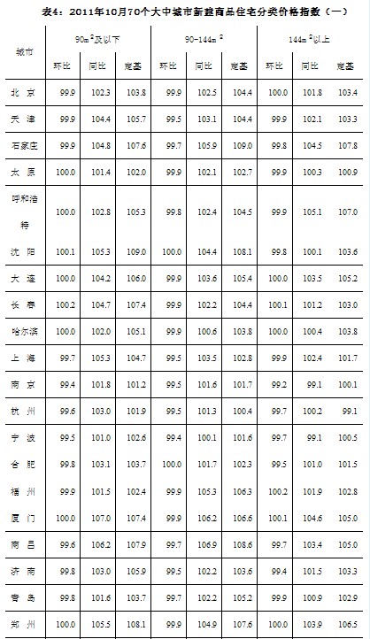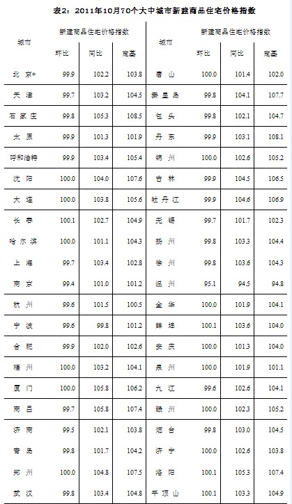(一)与上月相比,70个大中城市中,价格下降的城市有34个,持平的城市有20个。与9月份相比,10月份环比价格下降的城市增加了17个。环比价格上涨的城市中,涨幅均未超过0.2%。