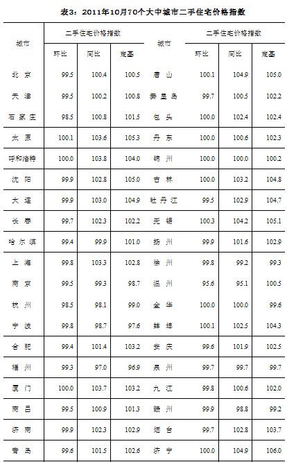 (二)与去年同月相比,70个大中城市中,价格下降的城市有13个,比9月份增加了6个。同比涨幅回落的城市有43个。10月份,同比涨幅在5.0%以内的城市有51个,比9月份增加了1个。