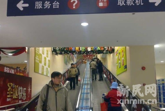 普陀区乐购大渡河路店内,一坐着轮椅的老翁顺着电梯滚下,带倒电梯上另一名顾客。