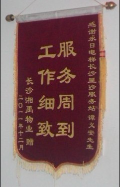 今年十月份,长沙美景物业方略学府佳境和长沙顺安物业筑梦园小区的领导分别送来两面锦旗鼓励我们广州永日电梯工程有限公司长沙分公司的全体同仁,“优质服务、工作兢业;服务周到,随叫随到。”贴切的表达了物业公司对永日电梯严谨的工作态度,优质的售后服务给予了充分肯定和赞扬。