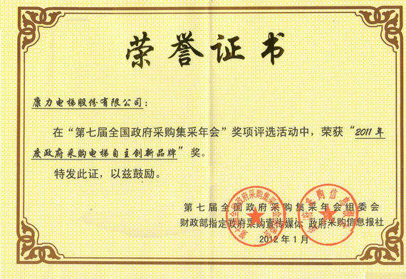 2012年1月11日,第7届全国政府采购集采年会在北京隆重召开,康力电梯应邀参加该盛会,并获颁“2011年度政府采购电梯自主创新品牌”荣誉,康力电梯已连续四次获得该荣誉,这是对康力电梯在政府采购领域取得成绩的肯定,更是对康力电梯一贯坚持自主创新的鞭策。