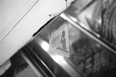 君太百货部分扶梯,夹角处提示板高度近60厘米,板上写有“请勿将头伸出扶梯外”字样,悬绳较长的提示板,垂至扶手带下缘。