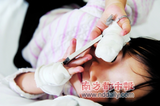 佳佳的病历也显示,佳佳的左小指属于离断伤,右手的中指和环指,指节均为粉碎性骨折。昨日,记者在北大医院见到佳佳时,佳佳的手指上仍缠着胶布。但断指的伤痛似乎已经远去,佳佳仍调皮地在床上玩闹,见记者拍照,亦露出笑脸。而因为此事给佳佳留下终身残疾,佳佳的父母则忧心忡忡,“左手的小指头已经断了,希望再次手术后右手的两根指头能恢复。”
