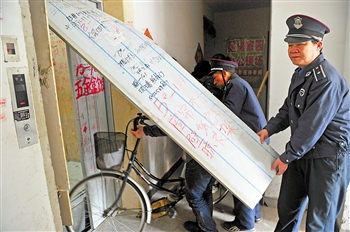 近日,天津市红桥区睦华里小区14号楼的电梯发生故障,3名业主被困近1小时。随后,小区电梯维修人员赶到现场才得以施救。图为工作人员将电梯门卸下。
