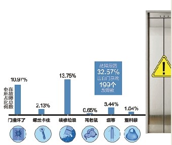 造成电梯故障的原因里,脆弱的电梯门再次成了症结所在,足足占了1/3(见图)。其中最离奇的是有21起事件都是由于烟蒂引起的。小小烟蒂为何有如此威力?维修人员告诉记者,电梯门缝里一旦卡有异物,即使门关上了,电源触点也连接不上,电梯就会停住,这是电梯安全运行的一种自我保护。